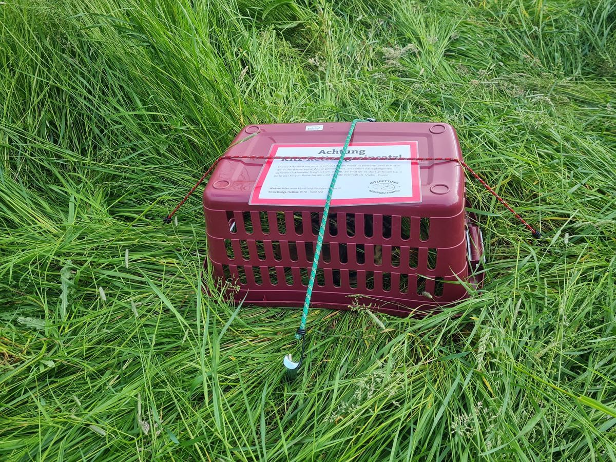 Liebe Wanderer / Spaziergänger, wenn ihr mich / uns in so einem Korb entdeckt, dann geht es uns gut, denn wir werden gesichert und sind somit in Sicherheit vor dem Mähwerk und dem Mähtod. Nachdem das Feld gemäht ist, werden wir wieder freigelassen und unsere Mamas finden uns wieder. Daher lasst bitte den Korb mit Sicherung unberührt, er schützt uns vor dem Tod.