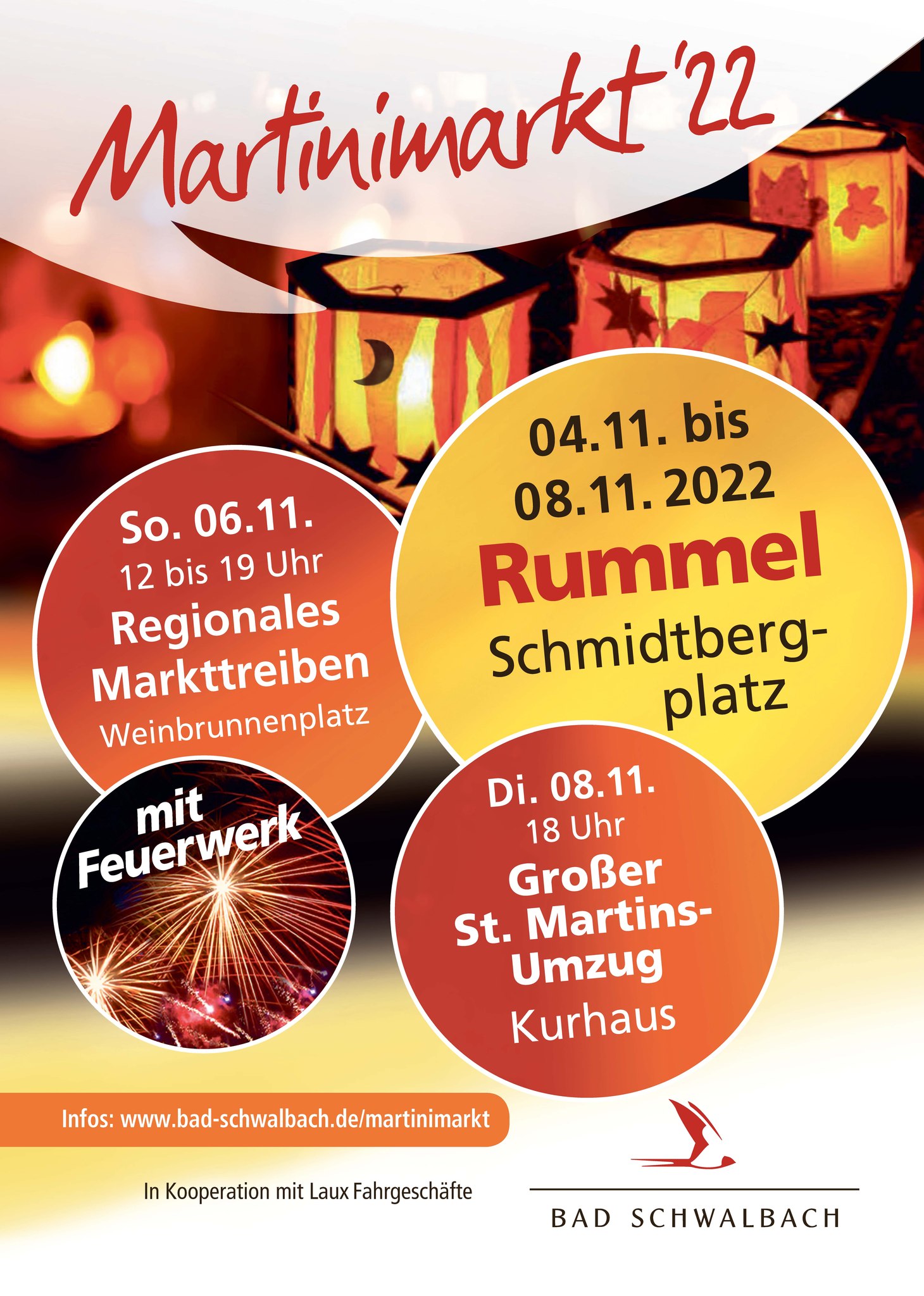 Der Martinimarkt hat eine lange Tradition in Bad Schwalbach. In diesem Jahr findet die Veranstaltung vom 4. bis 8.11.2022 statt und soll in neuem Glanz erstrahlen. Ein Konzept, welches sich bereits 2018 zur Landesgartenschau bewährte, soll in diesem Jahr erneut umgesetzt werden. Sonntags wird es daher von 12 bis 19 Uhr ein buntes Markttreiben auf dem Weinbrunnenplatz mit abschließendem Feuerwerk geben. Dies ist das nachgeholte Feuerwerk, dass wegen der Trockenheit zum Sommernachtsfest nicht stattfinden konnte. Beginn ist um 18 Uhr. An allen Veranstaltungstagen von Freitag bis Dienstag erwartet die Besucher ab 14 Uhr Rummeltreiben mit Fahrgeschäften und Buden auf dem Schmidtbergplatz. Das erstmalig auf dem Rummelplatz stehende Riesenrad wird das Highlight für Groß und Klein – einen tollen Blick über Bad Schwalbach erhalten. Zudem sollen die beiden Veranstaltungsorte durch einen kleinen Shuttlebus miteinander verbunden werden. Die Taktung des Shuttles ist halb stündlich von 12 Uhr bis 19 Uhr. Die Haltestellen befinden sich am Wiedbachplatz (Busparkplatz der Wiedbachschule) und vor dem Kurhaus.
